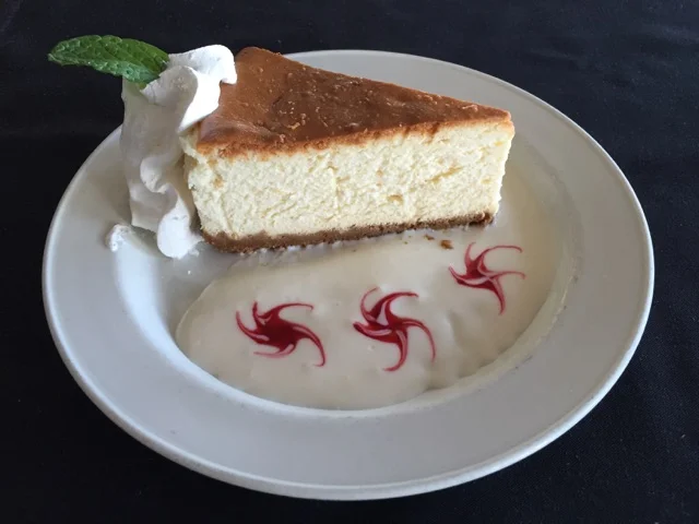 Lemon cheesecake on top of a lemon sour cream sauce drizzled with raspberry puree and finished with a dollop of fresh whipped cream.